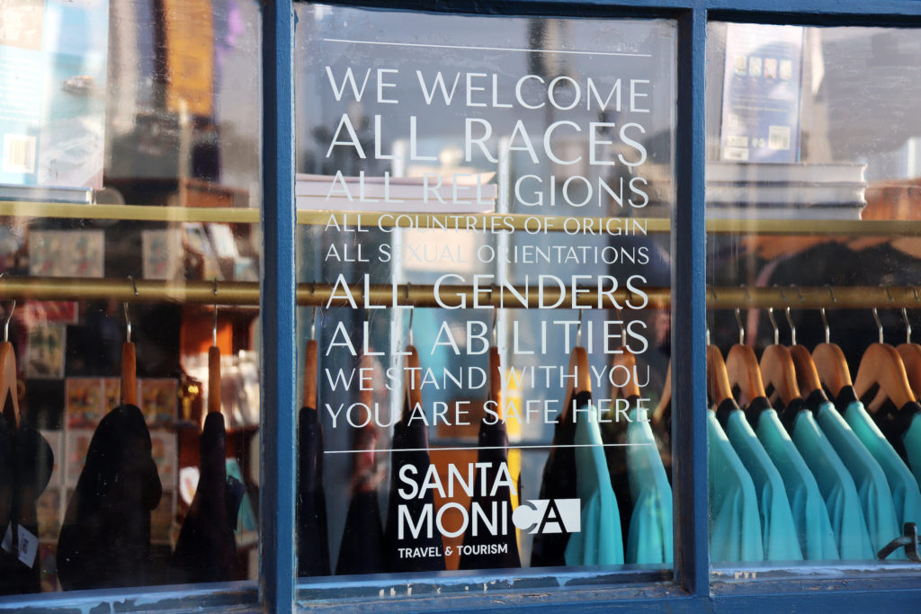 Private shops on the public pier welcome paying customers with decals from Santa Monica Travel & Tourism.